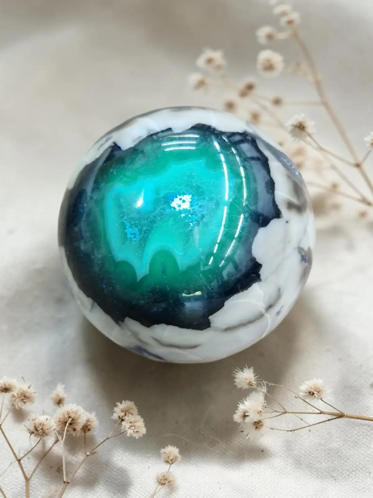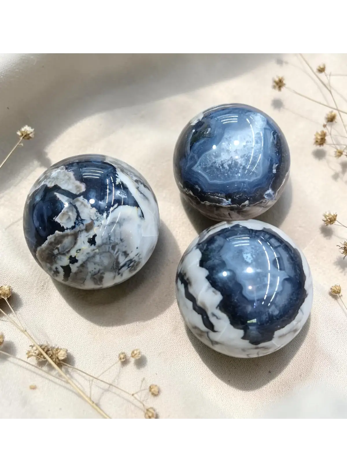 Posebnost: Vsaka ahatna krogla je popolnoma unikatna, njeni vzorci, prehodi barv in strukture so ustvarjeni v naravi in jih ni mogoče ponoviti. Ta kombinacija temnih in svetlih delov daje krogli še posebno globino in moč. Idealna za prostor, meditacijo ali kot čudovit dekorativni kos z močno energijo.