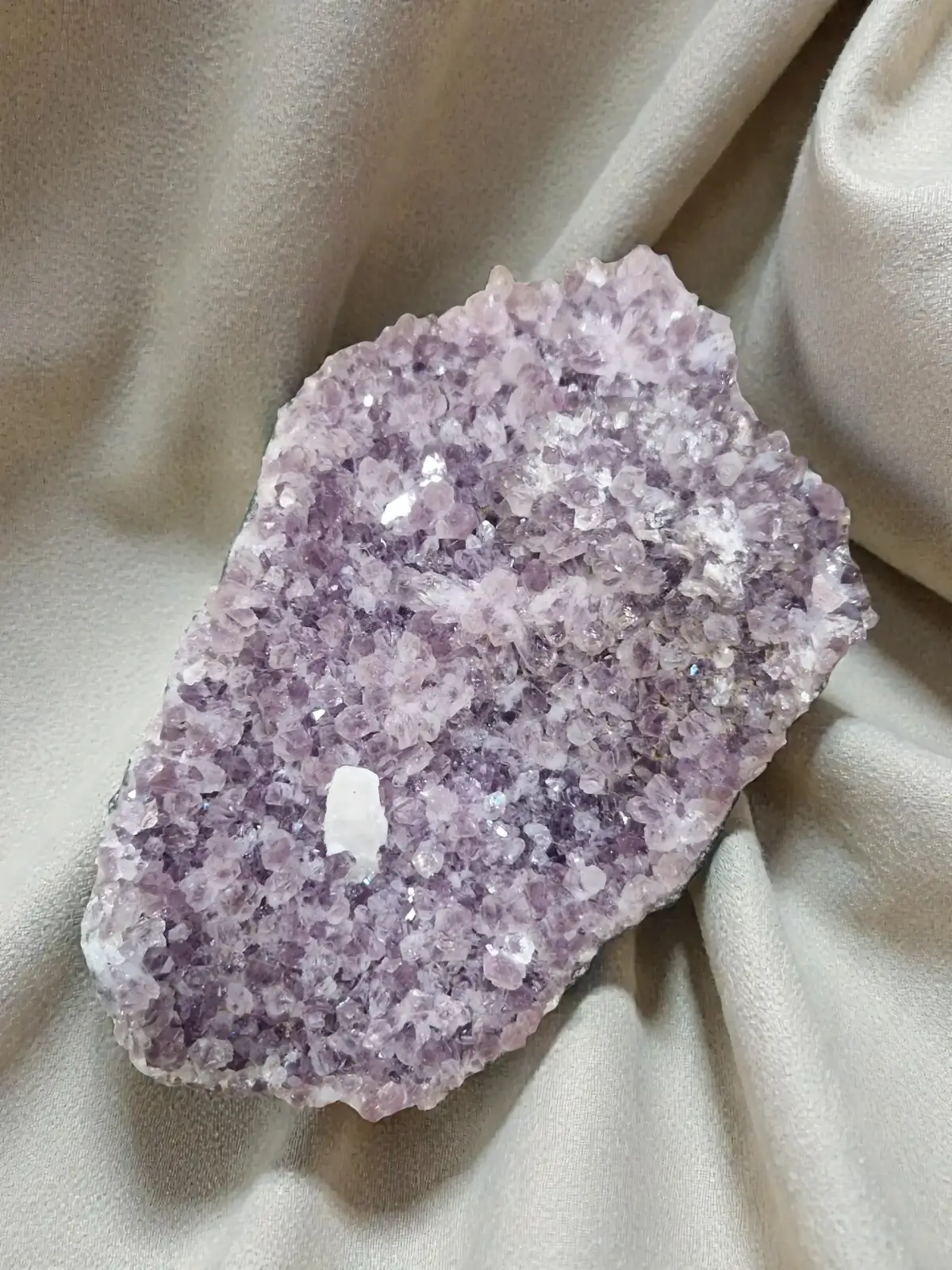 Ta poseben kos združuje globoko pomirjujočo energijo Ametista z nežno, svetlobno vibracijo Kalcita. Skupaj ustvarjata harmonijo, ki podpira čustveno ravnovesje, notranje čiščenje in nežno raztapljanje starih napetosti.