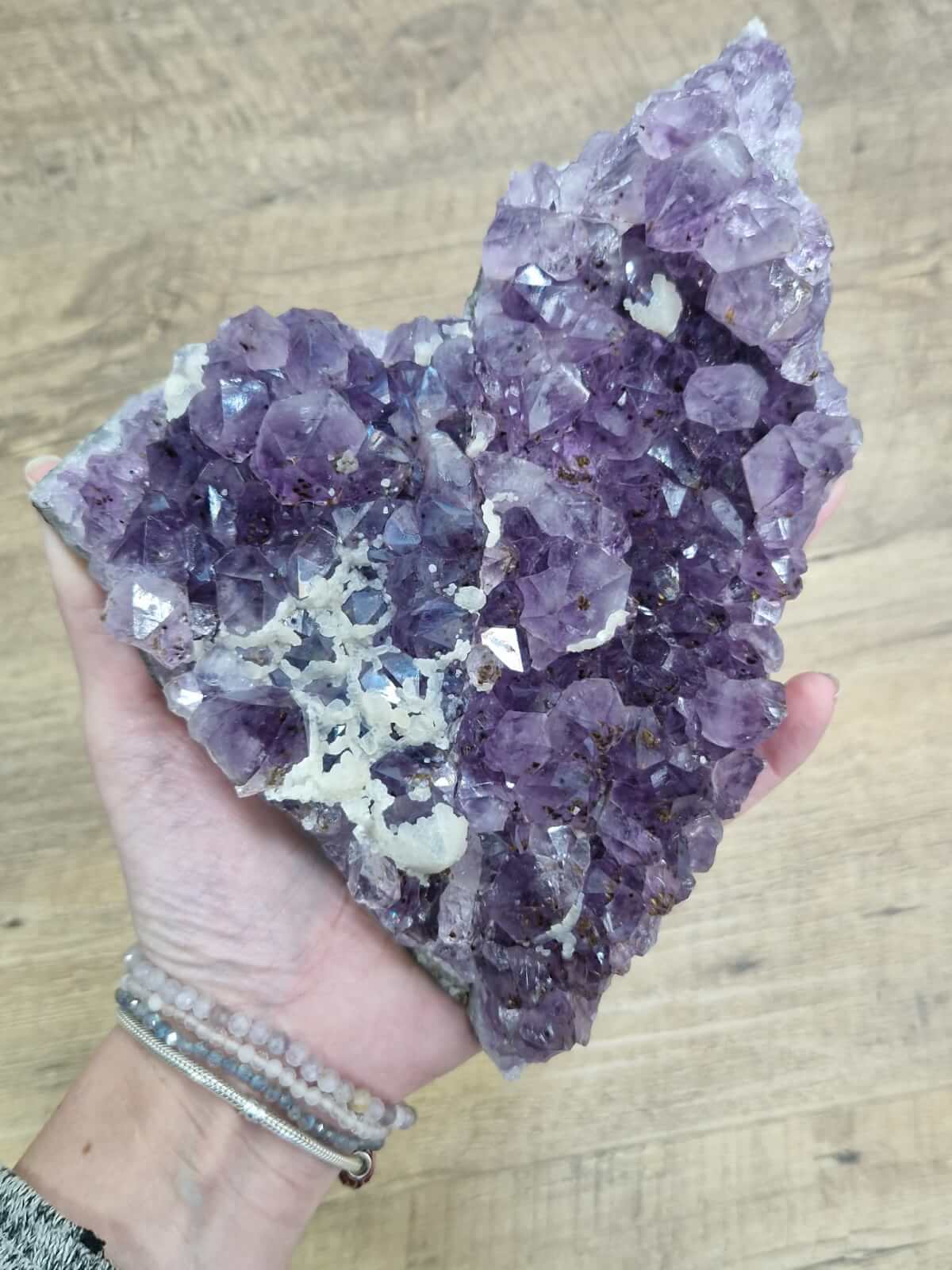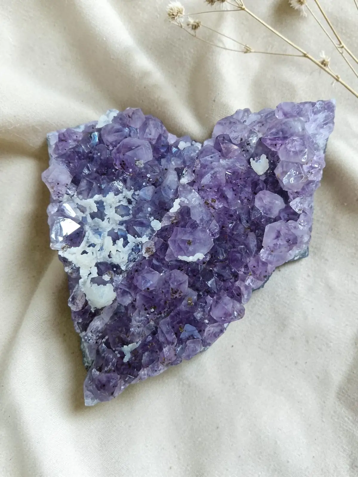 Ta poseben kos združuje globoko pomirjujočo energijo Ametista z nežno, svetlobno vibracijo Kalcita. Skupaj ustvarjata harmonijo, ki podpira čustveno ravnovesje, notranje čiščenje in nežno raztapljanje starih napetosti.