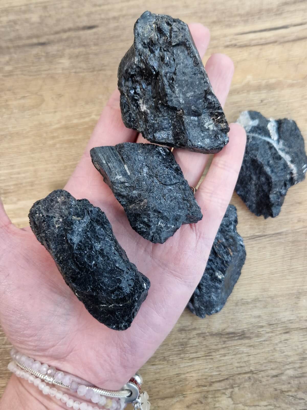 Črni turmalin je eden najmočnejših zaščitnih kristalov, ki ustvarja energijski ščit okoli tvojega telesa in prostora. Njegova globoka, črna barva v sebi nosi moč zemlje, stabilnost in mir, hkrati pa te osvobaja od negativnih energij in težkih čustev.