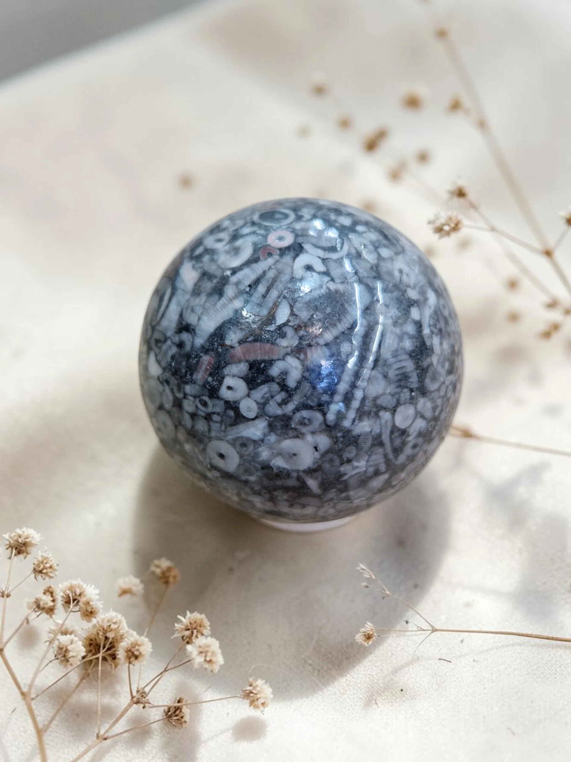 Ta edinstvena fosilna krogla v sebi nosi milijone let star zapis življenja. V njenem vzorcu se razkrivajo starodavne oblike, fosili, ki so nekoč živeli v oceanih, danes pa v tej obliki ustvarjajo čudovito naravno umetnino.