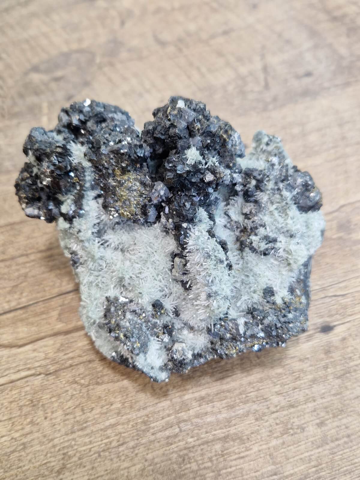 Ta mogočen kos združuje tri energije, v en sam čarobni kos. Iglasti Kremen, sijoč Galenit in Pirit. Že ob prvem pogledu začutimo, kako v sebi nosi moč, zaščito, stabilnost in jasnost.